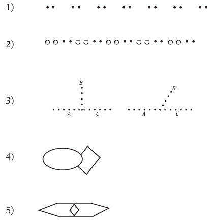 Pero el de proximidad no es el único factor que interviene en la agrupación perceptiva; hay otros. Entre ellos, el «factor de semejanza», que hace que, en igualdad de condiciones, se presenten como naturalmente agrupados los estímulos que son similares. En la figura 1.2) puede verse un agrupamiento de puntos en el que la semejanza prevalece sobre la proximidad.