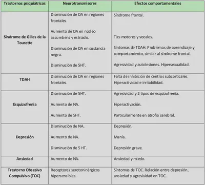 Tabla 9.2 Niveles de neurotransmisores, trastornos psiquiátricos y efectos sobre el comportamiento