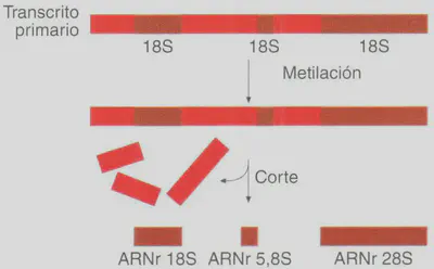 Los ARN ribosómicos y de transferencia también experimentan maduración. Así, en eucariotas, los ARNr 18S, 28S y 5,8S proceden de un solo transcrito primario que tras su maduración origina esos distintos ARNs ribosómicos (Fig. 2.21).