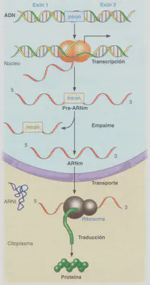 En algunos procariotas y en prácticamente todos los eucariotas, los ARNm experimentan una modificación de su estructura una vez sintetizados (Fig. 2.19). El ARNm que produce la ARN polimerasa se denomina transcrito primario. Éste porta la secuencia que codifica el polipéptido, sin embargo, esta secuencia no está colocada de forma continua en este ARNm, sino disgregada en varias secuencias a lo largo del transcrito primario, separadas por segmentos no codificantes, denominados intrones (secuencias intercaladas), para diferenciarlas de las que sí guardan información, las secuencias codificantes, denominadas exones (las que se expresan). En los eucariotas, los intrones representan un porcentaje mayor de la secuencia génica que el dedicado a los exones. A través de un proceso de corte y empalme (splicing) denominado maduración o procesamiento del transcrito primario, se eliminan los intrones y se colocan secuencialmente los exones, obteniéndose un ARNm maduro que porta la secuencia lineal de un polipéptido funcional. De igual modo, los ARN ribosómicos y de transferencia también experimentan maduración.