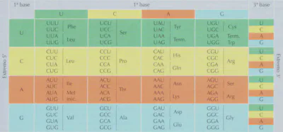 Durante los primeros años de la década de 1960 y gracias a los datos experimentales aportados por los grupos de trabajo dirigidos por M. Nirenberg, Severo Ochoa y H.G. Khorana, se comprobó que la base del código genético es el triplete (en el ADN), o codón (cuando nos referimos a ese triplete en el ARNm). Está constituido por una secuencia cualquiera de los tres nucleótidos de los cuatro posibles (de adenina, guanina, citosina y timina; el uracilo sustituye a la timina en el ARNm). El orden en que van los tripletes especifica el orden en que van los aminoácidos en las proteínas. Por tanto, un triplete especifica un aminoácido. La equivalencia entre todos los codones posibles y los distintos aminoácidos que forman parte de los polipéptidos se recoge en la Tabla 2.1: nótese que hay una correspondencia entre cada triplete que forma cada codón del ARNm y los tripletes complementario de una de las dos cadenas del ADN de la que se trascribió, y a la vez, una correspondencia entre la secuencia de codones del ARNm y la secuencia de aminoácidos en la proteína. Para entender de manera cabal cómo funciona el código genético, hay que entender las siguientes propiedades:
