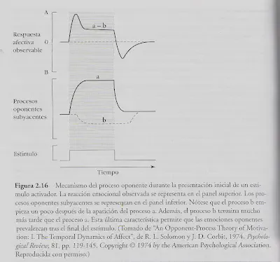 Por tanto, los procesos primario y oponente son mecanismos internos cuyos efectos son los cambios emocionales observados. (fig 2.12) Un presupuesto adicional básico para la teoría del proceso oponente es que el proceso oponente es ligeramente ineficiente. Al principio permanece a la zaga de la alteración emocional primaria, y por tanto, no es lo suficientemente fuerte para compensar por completo la emoción primaria.