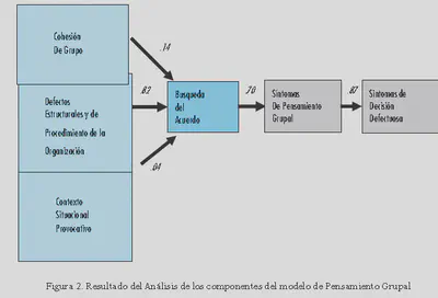 Se llevó a cabo un análisis de ecuaciones estructurales LISREL a partir de las correlaciones entre los distintos componentes del modelo de pensamiento grupal. Los resultados se presentan a continuación (coeficientes beta estandarizados) y ponen en cuestión el papel de la cohesión y de los estresares situacionales como antecedentes necesarios y suficientes del pensamiento grupal. La búsqueda del acuerdo mantiene su posición central en el modelo entre los antecedentes, representados por los defectos estructurales y de procedimiento y los síntomas de pensamiento grupal y de decisión defectuosa.
