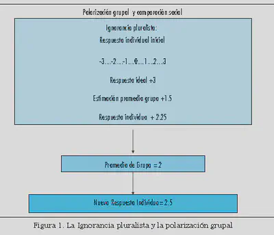 - La Ignorancia pluralista (Pruitt, 1971) que supone que los miembros del grupo subestiman la norma de grupo sobre la cuestión y su respuesta resulta de un compromiso entre la respuesta ideal (la posición que ellos admiran más) y el promedio del grupo. Cuando advierten cuál es la auténtica norma de grupo —en sentido del promedio— en la siguiente elección se aproximan más a la respuesta ideal, es decir, el nuevo compromiso está más polarizado.