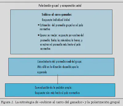 - Proceso de «subirse al carro del ganador» propuesta por Myers (1978) que supondría querer ser diferentes y, al mismo tiempo, mejores. Los miembros del grupo anticipan que el grupo dará una respuesta y dan la suya de forma que sea un poco superior a ese promedio. Cuando comprueban cuál es realmente ese promedio tratan de mejorar su posición, y así se produce el cambio hacia el polo deseable de la escala. Con frecuencia el promedio inicial antes de la discusión cae hacia el polo del continuo, que resulta normativamente favorecido. Cada individuo anticipa cual puede ser el promedio y desea ser considerado de modo más favorable que el promedio. Así si en una situación resulta socialmente deseable decantarse en una dirección, por ejemplo mostrarse no racista, al hacer la primera evaluación estiman cuál será el promedio del grupo para estar algo por encima, si todos los miembros hacen lo mismo, dicho promedio acabará estando más en la dirección deseable que lo esperado. Ello hace que el miembro individual reevalúe su propia preferencia y la aumente en la dirección deseada, es decir se polarice el juicio. (Figuras 1 y 2).