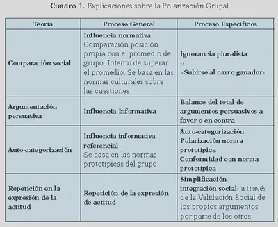 Se ha ido produciendo una progresiva reducción de las explicaciones acerca de la polarización, siendo las dominantes las que se centran o bien en el proceso de comparación social o en bien en la argumentación persuasiva, estableciendo entre ella una rivalidad fructífera.