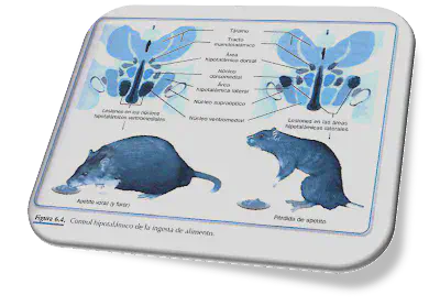 El hipotálamo lateral (HL) y el hipotálamo ventromedial (HVM) controlan la ingesta de comida y la saciedad. El HL induce hambre, ayuda a regular el peso corporal en el punto de ajuste o equilibrio; por su parte, el HVM deprime la sensación de hambre aunque para ello necesita interactuar con el páncreas.