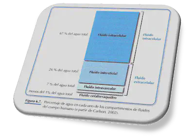 En el organismo el agua se distribuye dentro y fuera de las células. El líquido intracelular (aprox. 2/3 del agua corporal) y el líquido extracelular (aprox 1/3 del agua corporal), que incluye los líquidos cefalorraquídeo, el intersticial (el que está entre las células) y el intravascular, constituyen los cuatro compartimentos de fluídos del organismo (1 intracelular y 3 extracelulares). Todos ellos están separados por barreras semipermeables que permiten el paso de ciertas sustancias.