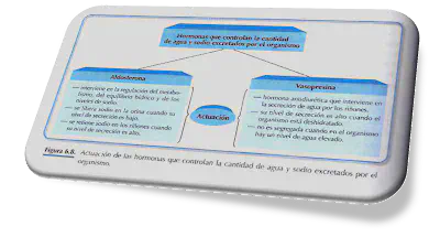 Los riñones son los que efectúan la regulación del nivel de agua y de sodio en el organismo. Las hormonas que intervienen en ello son la aldosterona (hormona secretada por la glándula suprarrenal) y la vasopresina (hormona secretada por la neurohipófisis). La aldosterona regula los niveles de sodio (cuando hay niveles altos de aldosterona se retiene el sodio en los riñones, y si los niveles son bajos, el sodio se elimina por la orina), mientras que la vasopresina (u hormona antidiurética, cuando sus niveles son altos se tiende a retener líquido, generalmente cuando el organismo está deshidratado; y cuando hay exceso de líquido en el cuerpo, baja el nivel de vasopresina, con lo que se elimina líquido mediante la orina) lo hace con los niveles de agua.
