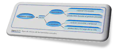 Son dos los efectos que las hormonas sexuales, segregadas por las glándulas sexuales, ejercen sobre la conducta: un efecto organizador y un efecto activador. El efecto organizador tiene que ver con el dimorfismo sexual (=diferencias entre machos y hembras) y se caracteriza por ser irreversible y producirse durante el período prenatal. El efecto activador hace referencia al papel que las hormonas tienen sobre el organismo maduro de forma reversible y temporal.
