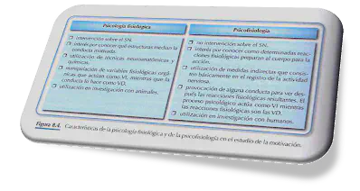 La Psicofisiología: sin intervenir en el sistema nervioso, se preocupa por conocer qué cambios fisiológicos se producen ante determinadas situaciones estimulares. En el estudio de la motivación, la psicofisiología se interesa por cómo determinadas reacciones fisiológicas prepara al cuerpo para la acción, siendo el concepto de activación determinante en sus planteamientos.